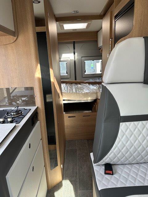 Iluminação em LED. Iluminação indirecta e nocturna. Claraboias panorâmicas mini Heki, frigorifico Thetford Slim 142 lt, Aquecimento a diesel Truma Combi D, pré-instalação de televisão, pré-instalação painel solar, janelas Dometic, isolamento das paredes e tecto, chão de Poliestireno. Roupeiro retrártil com duas portas.