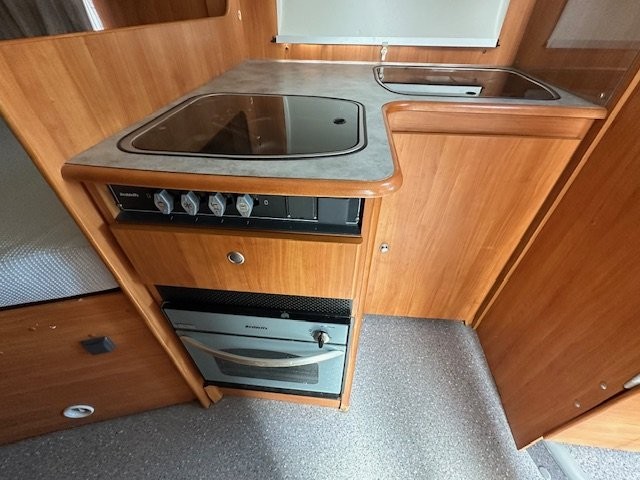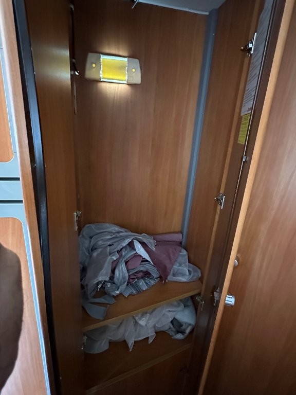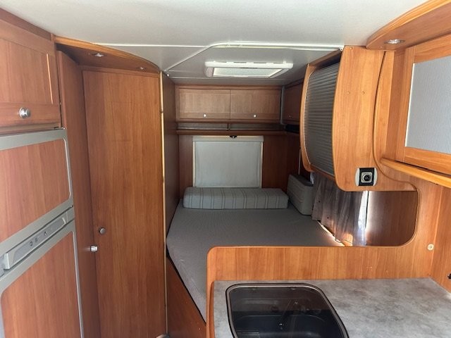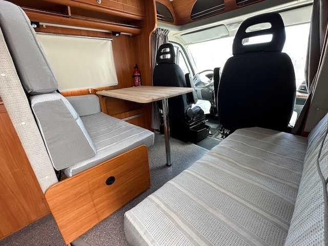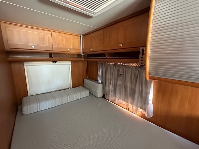 Cama de casal na lateral traseira esquerda ( Suite á Francesa). Casa de banho com sanita, cabine de duche separado. Cozinha com muitas portas e armários, sala com um sofá de frente e outro na lateral. Baixando a mesa temos outra cama de casal. O estrado da cama levanta-se para acesso pelo interior, existem tb uma porta exterior de acesso a esta mesma cama de grandes dimensões.